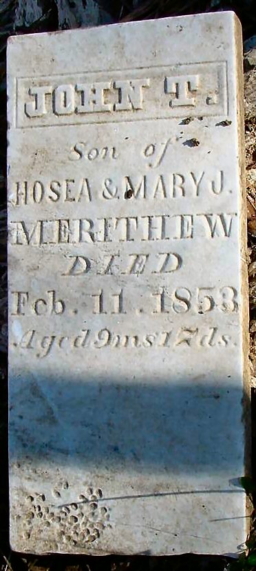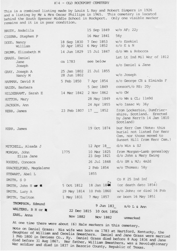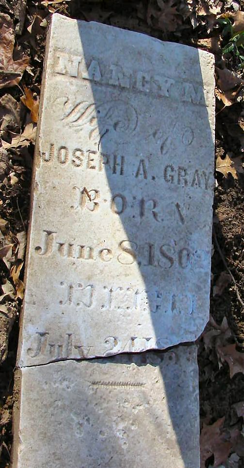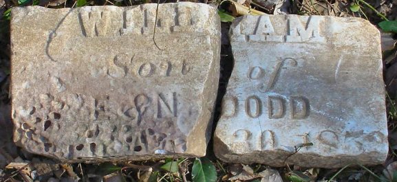 This is a copy of the list from the Spencer County Historical Society readings done in 1926 and 1965. The following grave markers were found during workdays in 2004 and are not on any of the cemetery lists from 1926 or 1965. More information about these people can be found in the Eagle Scout manuscript by Dakota Schmitt. The stone reads: The stone reads: The stone reads: Other stones in the cemetery on January 21, 2004. This tombstone of Stephen Cissna was uncovered by a high school student January 24, 2004. These appear to be two stone bases or markers found on the February 28, 2004 work day. William H. Maning is not listed on the 1926/1965 survey of the cemetery. His stone was recovered in 2006 by Dakota Schmitt under about a foot of dirt. The stone states that he was the adopted son of A. T. and F. D. Bullock. Born September 4, 1855 and died July 13, 1857. |